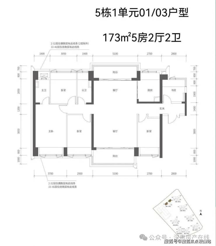 【五栋一单元-平面图】3梯3户,3条腿,分别是01、03号房户型约173㎡的5房2厅2卫、02号房户型约149㎡的5房2厅2卫