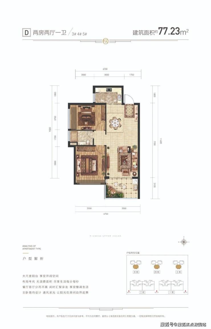 D户型面积:建筑约77㎡ 2房2厅1卫