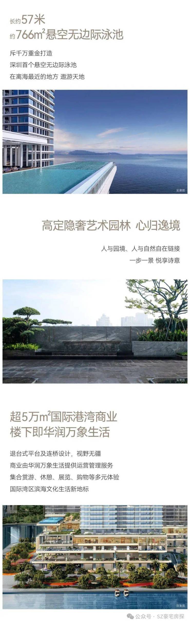 内部配套:配备高端私密会所、约 766 平方米的深圳首个悬空无边际海景泳池、首层城市花园、健身房、儿童游乐区以及 1800 平方米的海洋博物馆等设施。