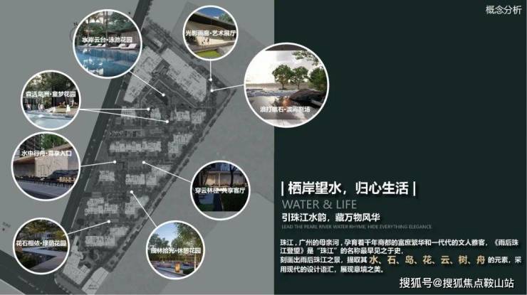 豪宅园林缔造者上海朗道景观规划设计有限公司,从刻画雨后珠江之景的《雨后珠江登望》中提取水、石、鸟、花、云、树、舟的自然元素,以现代的设计展现自然景观的惬意意境之美,为高净值人群的生活体验和使用需求提供顶级生活范本。