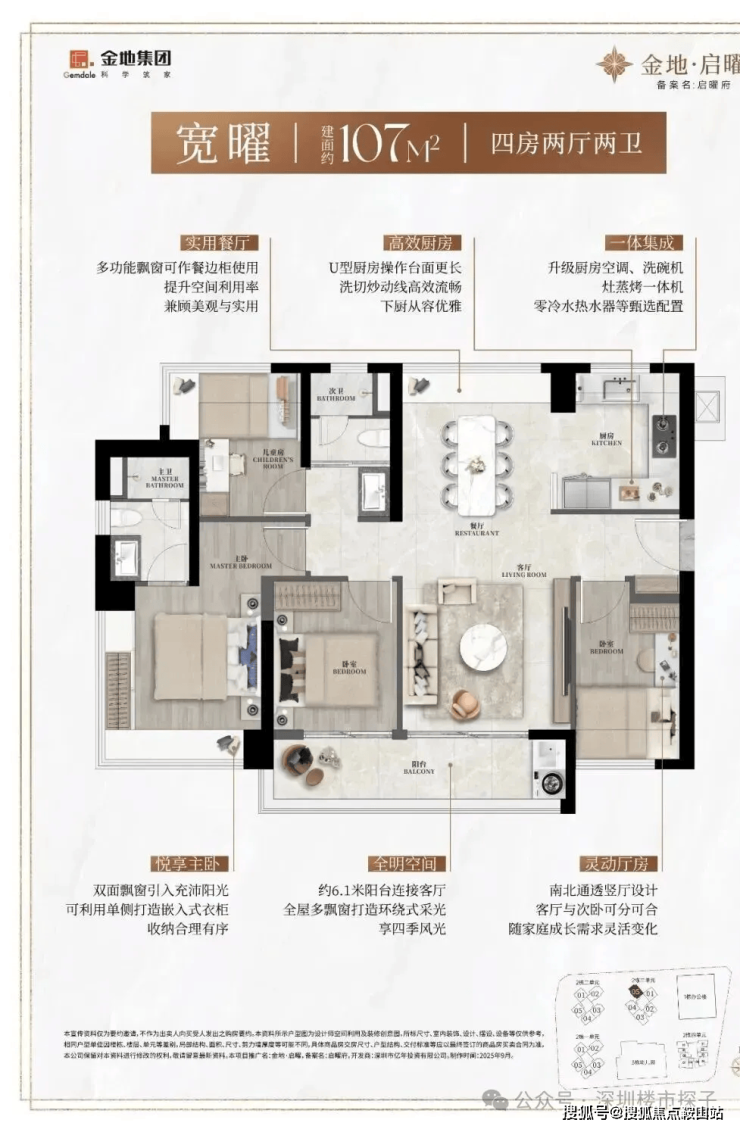 107㎡的4房2厅2卫,设计:竖厅南北通透,客餐厅分离,四室朝南,主卧270°飘窗,U型厨房,公卫干湿分离。得房率约90%(含赠送),客厅餐厅通6.1米阳台,西南向。