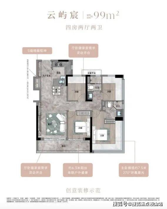 99㎡的4房2厅2卫,设计的是竖厅格局,客厅3.35米开间,LDKB一体化,S墙设计预留双开门冰箱卡槽位,三开间朝南,动静分区,分别做到了主卧15.26㎡/次卧9.57㎡/次卧6.96m²/次卧6.96㎡(包含墙体飘窗),U型厨房,公卫三段式干湿分离,赠送设备平台,得房率约78.27%(不含赠送),客厅连接次卧出9.37m²大阳台西南或东南朝向。靓点:99平做到了4房2卫,主卧270°无柱转角飘窗,厨房烟道外置+额外赠送设备平台,并且是纯南向格局。