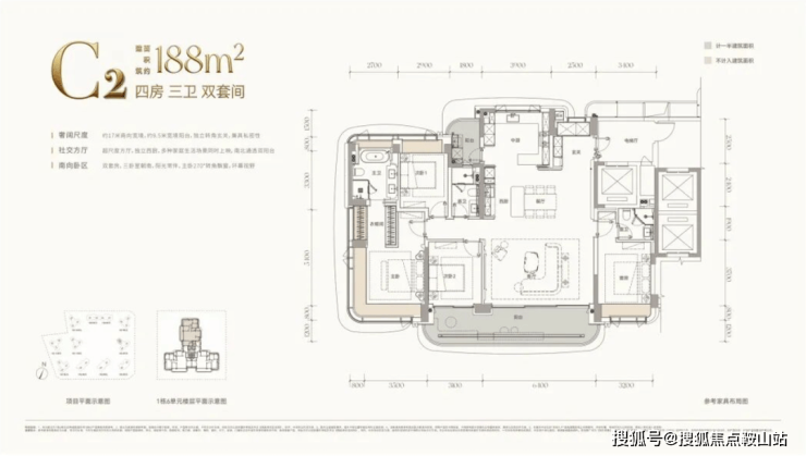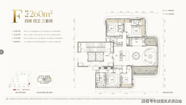 260平四房四卫:五单元专属户型,大小双阳台搭配,空间尺度阔绰,卫生间全明设计,是项目王牌户型。