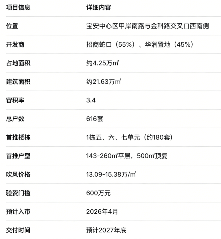 项目由双央企招商蛇口与华润置地联合打造,也是深圳首个联合打造的项目,不仅是2025年深圳总价地王,更是宝中近五年来出让的首宗低密度住宅用地;
