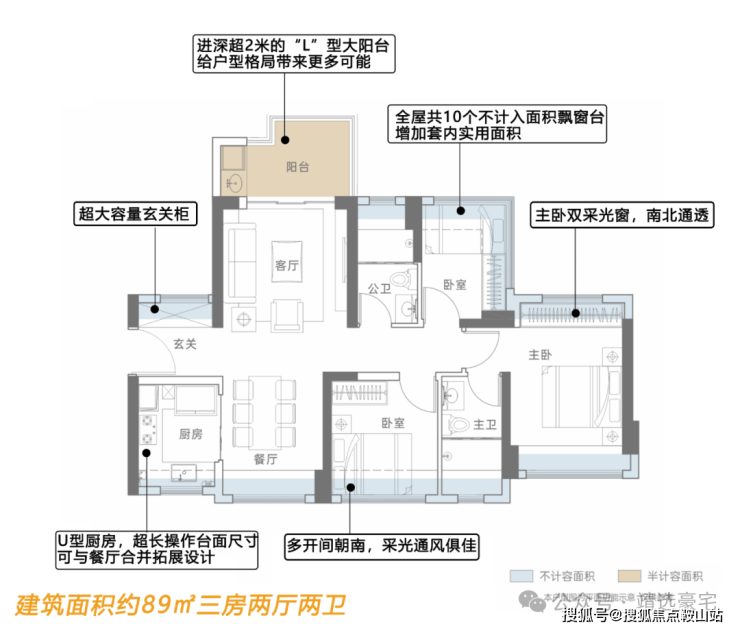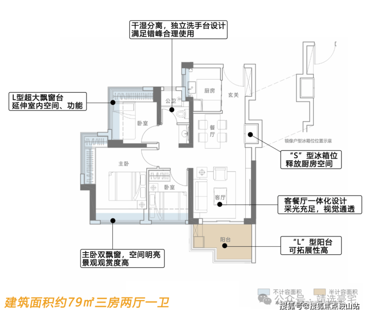 片区王牌户型-约79-89㎡全朝阳三房王牌住宅 得房率高达91%