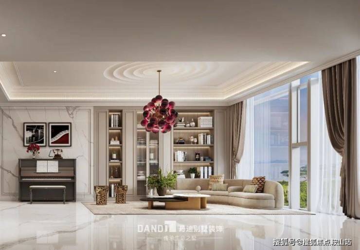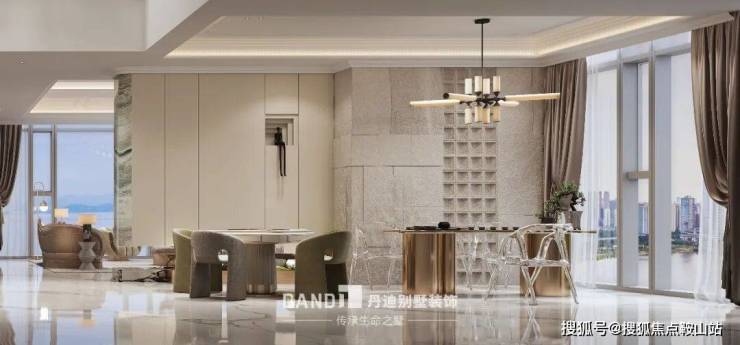 整体空间设计遵循“分层而居,各得其所”的理念,打造动静分明、功能完善的居住格局,兼顾社交排场与私密生活。一层规划为开放式公共社交区,挑高客厅搭配全景落地窗,将海景与空间尺度拉满,成为居者会客、聚会的核心场域,客餐厨一体化设计让动线更流畅,既满足高端社交的体面需求,又能承载家人日常互动的温暖。