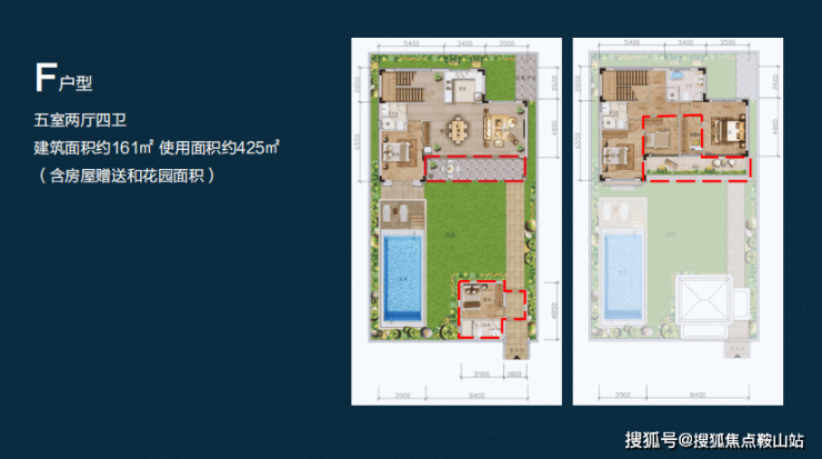 五室两厅四卫,建筑面积约179.90㎡,拓展后使用面积约411.99—476.99㎡(含房屋赠送和花园面积