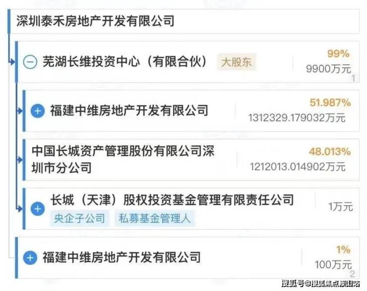 据企查查,按照最新认缴出资情况,芜湖长维投资中心为大股东,直接持股比例高达99%;泰禾实控的福建中维房地产开发有限公司,认缴出资额仅为100万元,直接持股比例1%。而芜湖长维投资中心股权穿透之后,长城资管持股比例达48%。