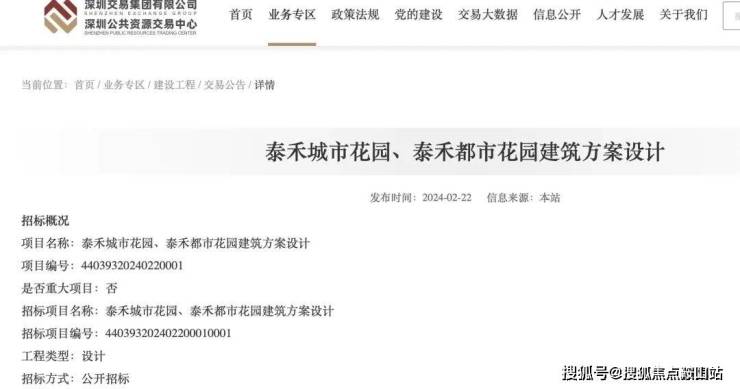 今年初,深圳公共资源交易中心发布了招标项目计划,将在2024年2月12日到2024年4月12日期间,对泰禾城市花园、泰禾都市花园项目建筑方案设计进行招标。