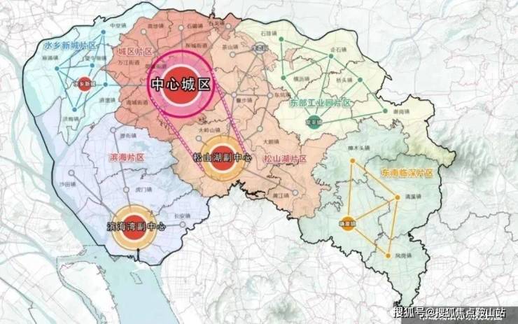 从双万城市东莞内部来看滨海湾地位,滨海湾新区是东莞两个副中心之一,和松山湖并列。