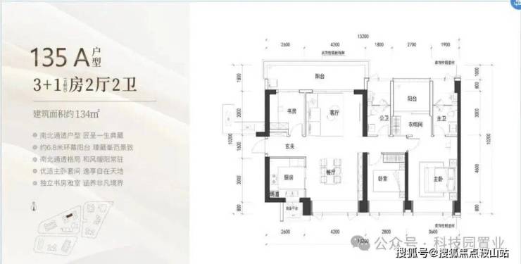 135㎡:横厅格局,南北双阳台设计,9.8㎡南向主阳台,三个房间面积分别达到9/11/15㎡,主卧带衣帽间和卫生间,舒适度非常好。