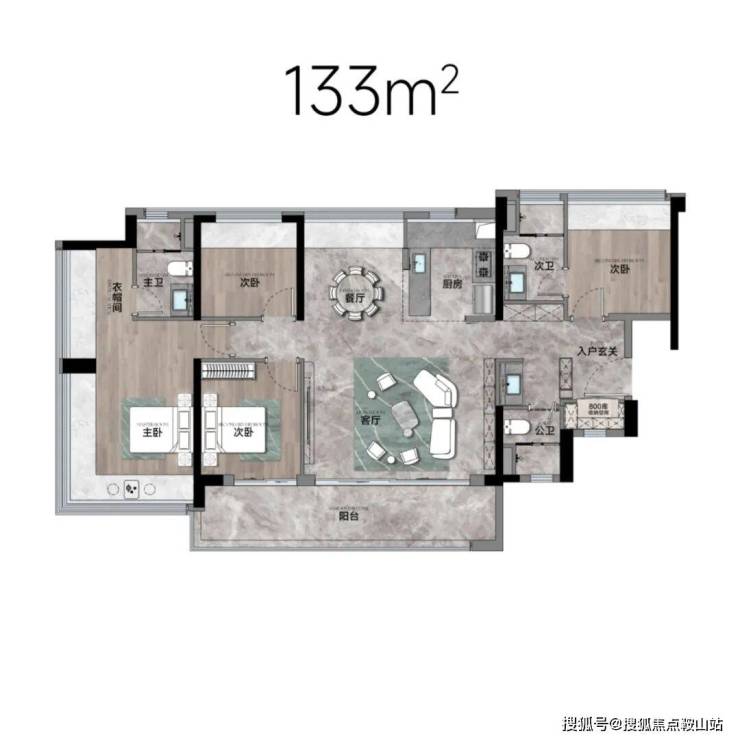 133㎡的4房2厅3卫,设计的是竖厅南北通透格局,得房率约79.5%(不含赠送),套内面积105.78㎡,阳台主朝东南或西南向。靓点:超大客餐厅南北对流+8.2米长超大观景南向阳台,超大主卧+270°无柱转角飘窗+进门独立玄关800库。
