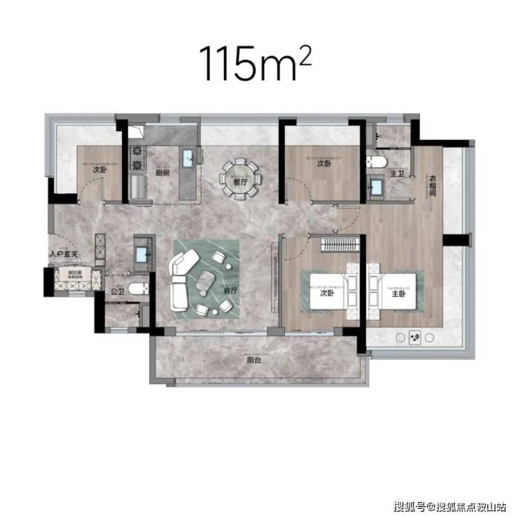 115㎡的4房2厅2卫,设计的是竖厅南北通透格局,得房率约77.9-79.5%(不含赠送),套内面积91.17㎡,阳台主朝东南或西南向。靓点:南北对流+7.25米长超大观景南向阳台,超大主卧+270°无柱转角飘窗+进门独立玄关800库。