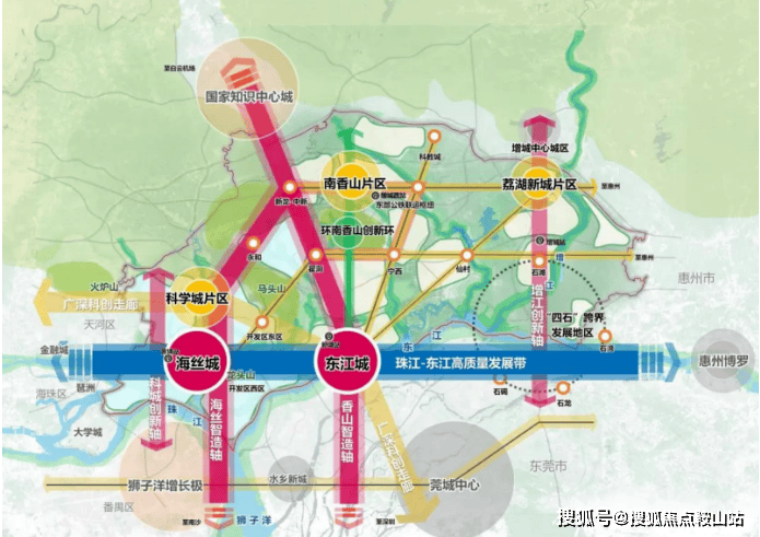在2024年,广东省公布了《广州面向2049的城市发展战略》,提出南拓东进的发展方针。其中东部中心将肩负高质量发展新动力源的重任,打造成为粤港澳大湾区现代产业融合发展引领区。支撑打造大湾区协同创新共同体,协同横琴、前海、南沙共同推动“黄金内湾”能级跃升,加快建成国际一流湾区和世界级城市群。东部中心将规划形成“一带四轴,双城三片”的空间结构,“双城”即海丝城、东江城,共同组成广州东部中心的核心城区,建设广州国际交往中心重要承载地。“三片”科学城片区、南香山片区、荔湖新城片区三大新兴产城融合片区。