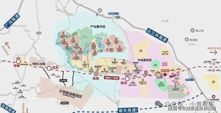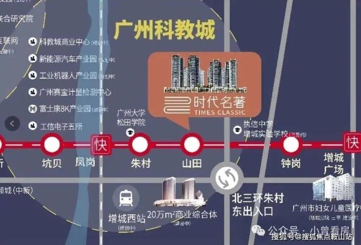项目所宣传的“地铁3站到黄埔”,是指从山田站坐到凤岗站,再换快线到达黄埔知识城的镇龙站,耗时约14分钟;“5站到天河”,是指到天河大观南路站,耗时约38分钟。