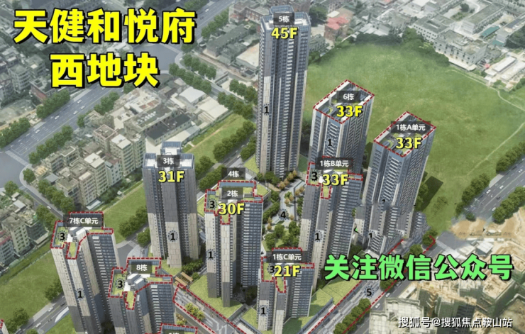 天健和悦府本次首推的是西地块,总占地面积约2.63万㎡,总建筑面积约18.43万㎡,计容建筑面积约13.56万㎡,容积率5,绿化率39.52%,共由7栋总高21-45层的住宅组成,其中1栋A座企业租赁住房33F,1栋B座商品房33F,1栋C座商品房21F,2栋住宅30F,3栋公租房31F,5栋商品房+公租房45F,6栋企业自持租赁住房33F,4栋是1所12班制幼儿园。
