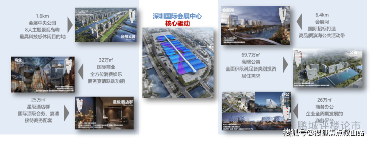 约160万㎡深圳会展中心,约154万㎡会展综合配套,形成包含城市地标、产业总部、商业中心、国际酒店群、产业展馆、精品公寓、生态公园、交通枢纽等复合功能物业群,构建集全球信息交流和消费体验于一体的会展商务平台
