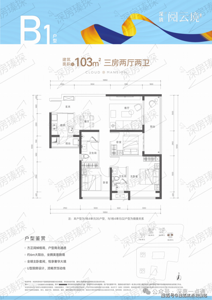 103㎡的3房2厅2卫,B1-1栋4单元02.05户型,设计的是经典竖厅格局,进门入户玄关,客厅3.5米开间,LDKB一体化,S墙设计预留冰箱卡槽位,三开间朝南,动静分区,3个卧室分别做到了主卧15.13㎡/次卧10.05/次卧7.71㎡(包含墙体飘窗),二字型厨房带1个3.24㎡大的生活阳台,卫生间干湿分离,得房率79.2%(不含赠送),客厅连接次卧出10.71㎡大阳台,正西或正东朝向。套内面积81.58㎡+赠送面积10.72㎡=实际使用面积92.3㎡,加上赠送后得房率约89.61%。
