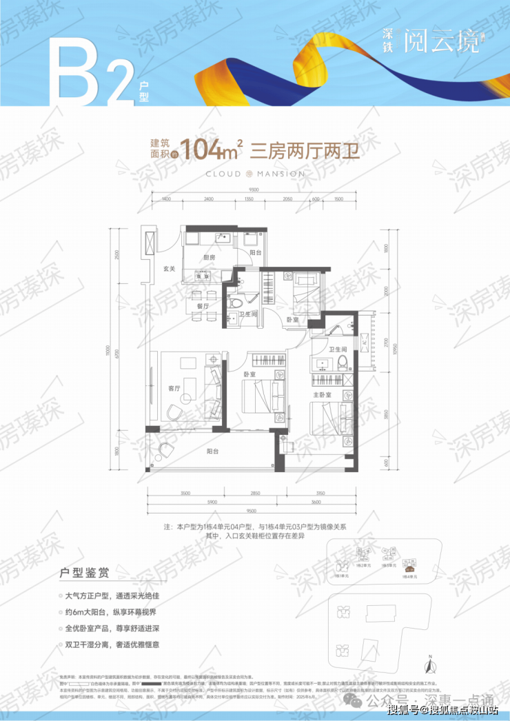 104㎡的3房2厅2卫,B2-1栋4单元03.04户型,设计的是经典竖厅格局,进门入户玄关,客厅3.5米开间,LDKB一体化,S墙设计预留冰箱卡槽位,三开间朝南,动静分区,3个卧室分别做到了主卧16.1㎡/次卧9.12/次卧6.89㎡(包含墙体飘窗),二字型厨房带1个2.43㎡大的生活阳台,卫生间干湿分离,得房率79.2%(不含赠送),客厅连接次卧出11.43㎡大阳台,正南朝向。套内面积82.37㎡+赠送面积10.14㎡=实际使用面积92.51㎡,加上赠送后得房率约88.95%。