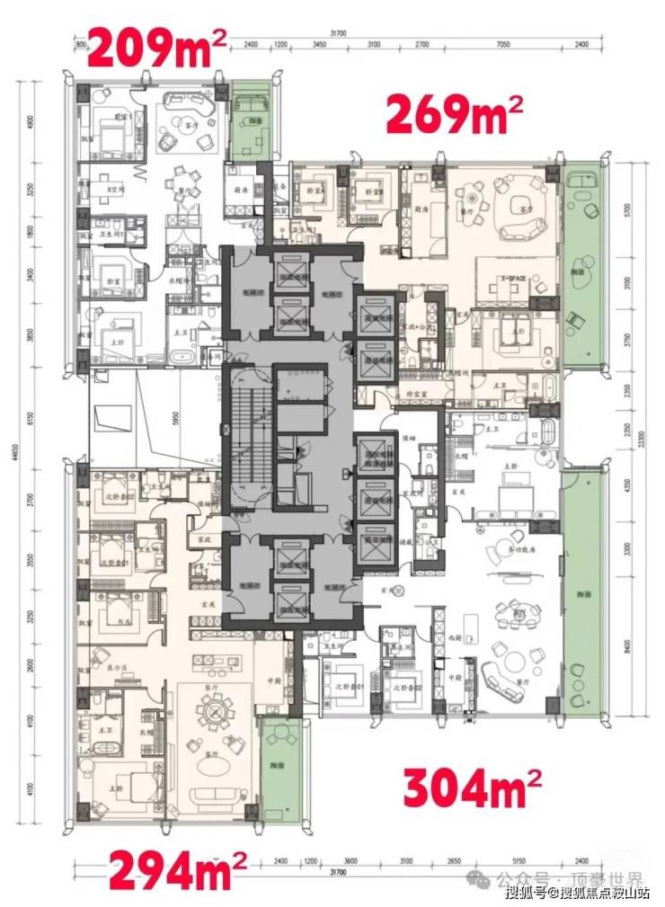 低区4F起150米以内是约209-304㎡四房大户型;