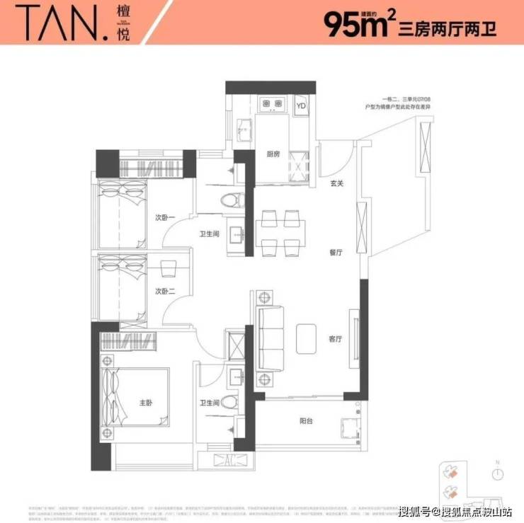 95㎡的3房2厅2卫,设计的是竖厅格局,LKDB一体化设计,进门入户玄关,有1个次卧做的双飘窗,U型厨房,卫生间三段式分离,得房率:74.34%(不含赠送),全部东南朝向。