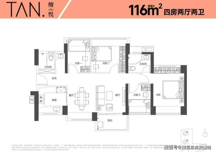 116㎡的4房2厅2卫,设计的是横厅南北通透格局,LKDB一体化设计,进门入户玄关,五开间朝南,超大宽面,主卧南北通设计,U型厨房,得房率:74.35%(不含赠送),阳台主朝东南向。