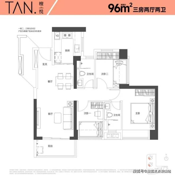 96㎡的3房2厅2卫,设计的是经典竖厅格局,LKDB一体化设计,进门入户玄关,动静分区,三开间朝南,有1个次卧做的双飘窗,U型厨房,得房率:74.34%(不含赠送),全部西南朝向。