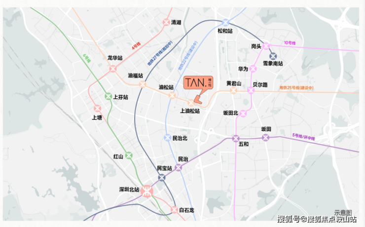 交通方面:项目周边靠近布龙路,五和大道,珠三角环线高速等交通要道,家门口就有25号地铁线“上油松站”在建,深惠城际“民治北站”距离约2公里,目前距离最近的10号地铁线“坂田北站”距离约1.7公里。