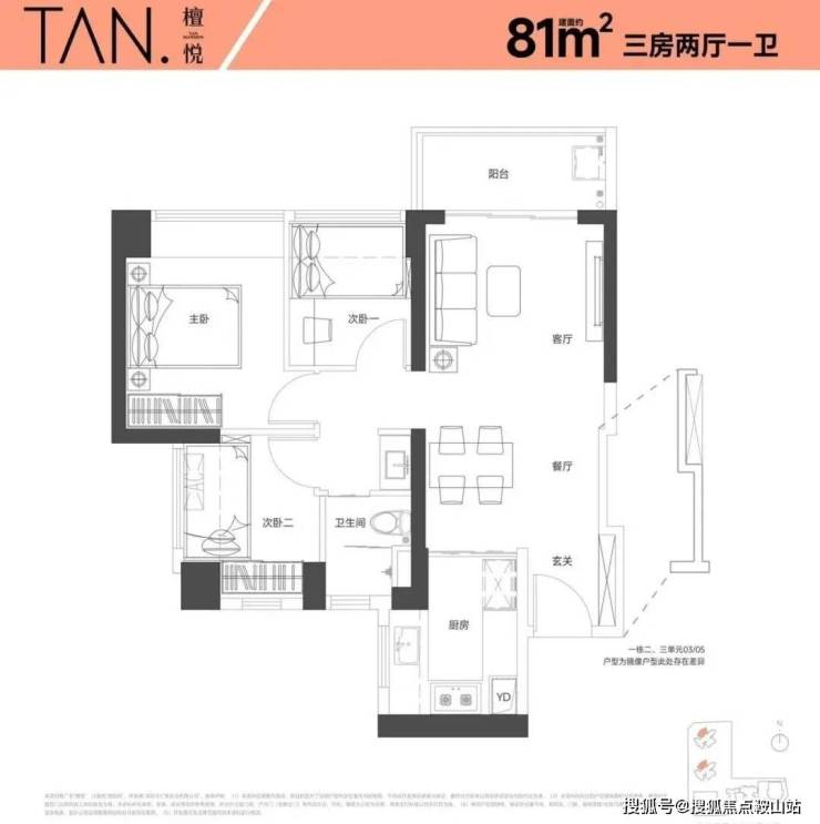81㎡的3房2厅1卫,设计的是竖厅格局,LKDB一体化设计,进门入户玄关,有1个次卧做的双飘窗,U型厨房,卫生间三段式分离,得房率:74.34%(不含赠送),全部西北朝向。