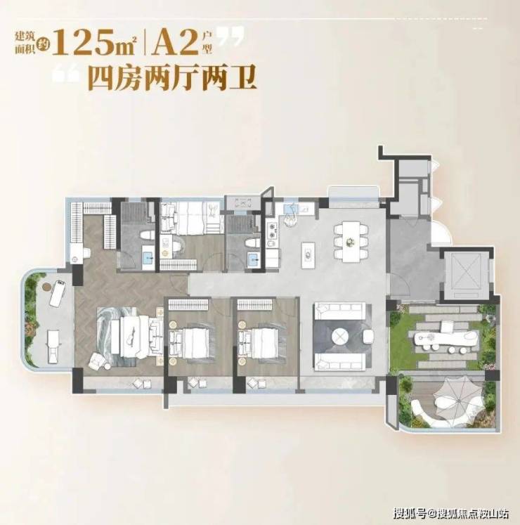 还有 125㎡的大四房,适合想改善居住条件的家庭。这个户型是南北对流的,客厅和餐厅分别对着两个阳台,夏天打开窗户就能穿堂风,连空调都省了。主卧面积超过 20㎡,除了衣帽间和卫生间,还能隔出一个小书房,晚上加班不用去客厅打扰家人。次卧里有一个带飘窗的房间,可以做成老人房,采光好又安静;另外两个房间,一个给孩子,一个做成多功能房,平时可以办公、健身,家里来客人也能当客房。厨房旁边还有个储藏间,平时囤的零食、日用品都能放进去,家里不会显得乱。