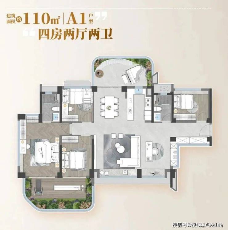 再看 110㎡的四房两厅两卫,特别适合二胎或三孩家庭。一进门有个独立玄关,回家可以随手放钥匙、挂外套,隐私性也不错。客厅和餐厅是竖厅设计,开间 4 米,摆上沙发和餐桌也不挤,周末叫上朋友来家里聚餐都够用。主卧是套房设计,带独立卫生间和衣帽间,早上夫妻两人洗漱不用抢,衣帽间还能放下全家人的衣服。另外三个次卧中,有一个直接连接着 7 米长的景观阳台,采光特别好,可以给老人住或者改造成儿童游乐区。厨房是 U 型布局,洗菜、切菜、炒菜动线合理,旁边还有个生活阳台,平时放洗衣机、晒抹布很方便。