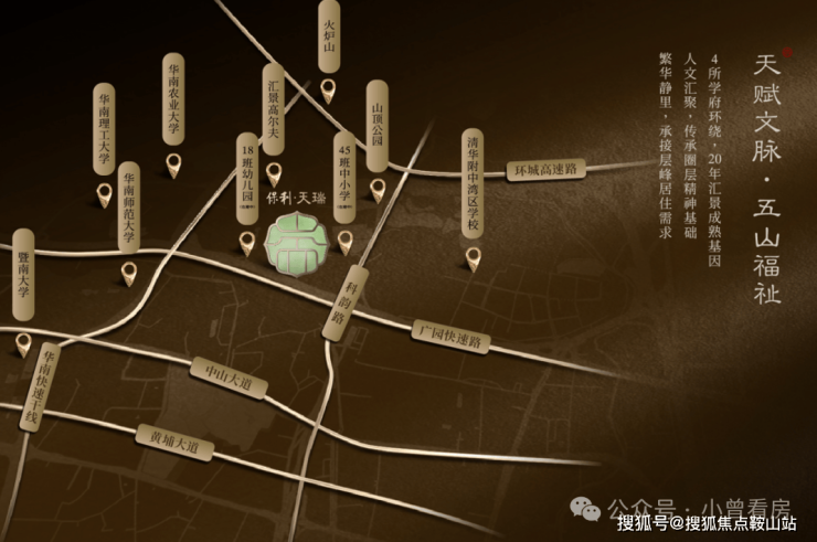 项目位于天河五山汇景新城板块内,珠江新城和琶洲金融城两中轴间的核心位置,楼盘身后就是汇景20年醇熟的圈层配套