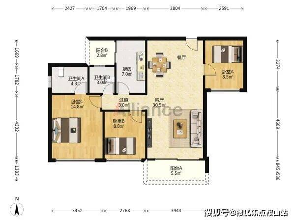 该户型朝西南和东南,南北透通,带两个阳台,餐厅和入户都可拓展,书房可改4房,不足之处在于玄关、过道处有点浪费面积。