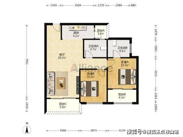 该户型方正,几乎没有浪费面积,客厅出大阳台,厨房带生活阳台,且为东南和西南朝向,动静分区合理。