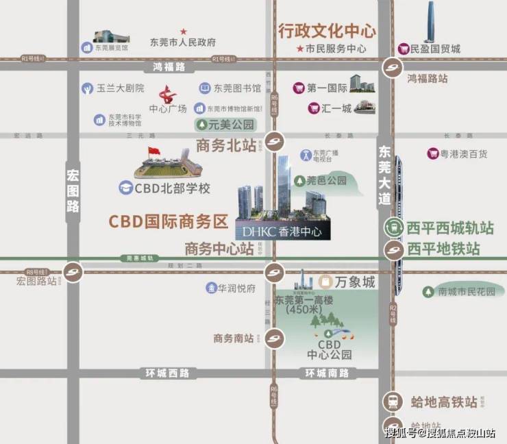 香港中心位于东莞都心—东莞国际商务区(东莞CBD),规划结构为“一心两轴四组团”,是东莞未来十年政府重点打造的城市中心区位。