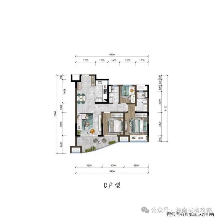 ▼“C”户型图约95㎡三室两厅两卫▼