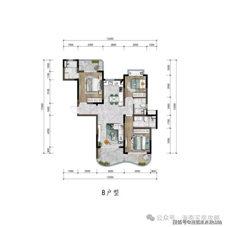 ▼“B”户型图约118㎡三室两厅三卫▼