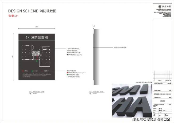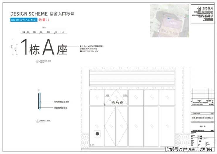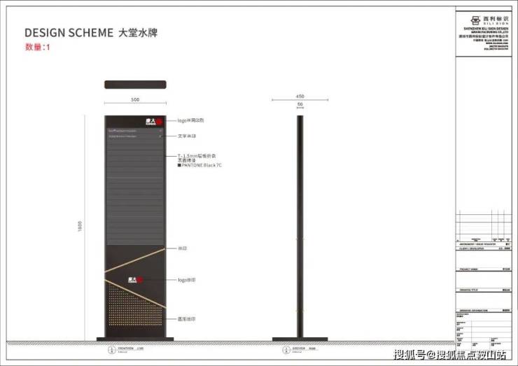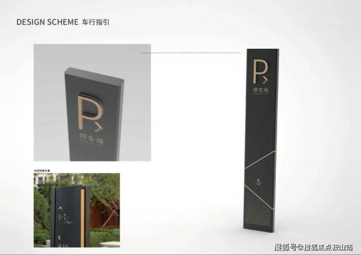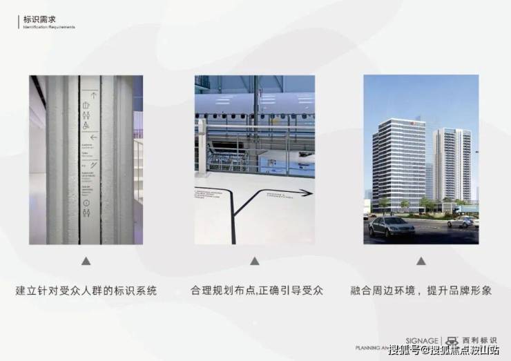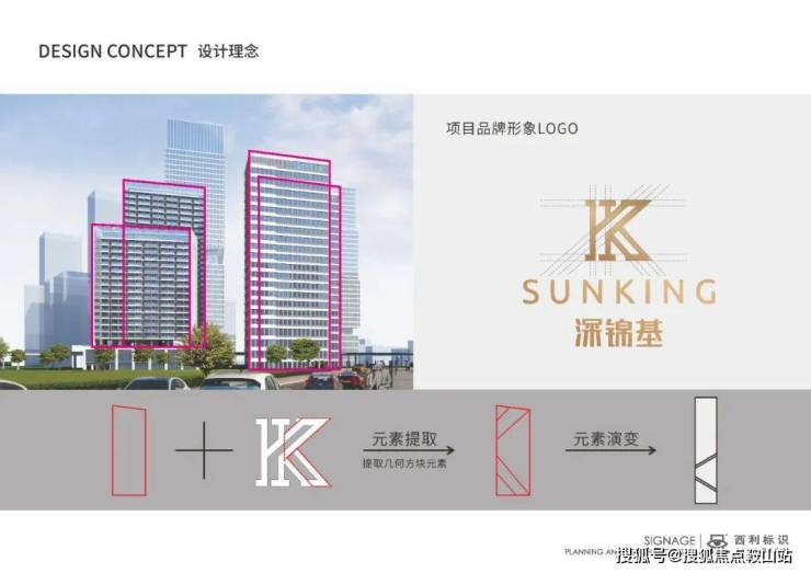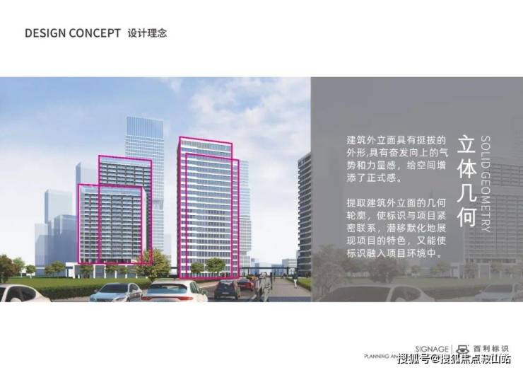 建筑外立面具有挺拔的外形,具有奋发向上的气势和力量感,给空间增添了正式感。提取建筑外立面的几何轮廓,使标识与项目紧密联系,潜移默化地展现项目的特色,又能使标识融入项目环境中。