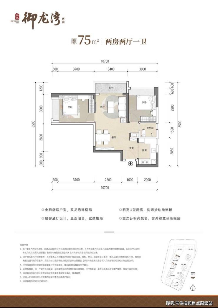 75平两房两厅一卫设计的是竖厅稀缺的双龙抱珠格局,客厅开间3.4米,U型厨房,卫生间三段式分离设计,得房率约73.26%(不含赠送),东南或西北朝向,加上赠送得房率约80%。阳基御龙湾售楼处电话☎:4001669557✔✔✔阳基御龙湾营销中心电话☎:400-166-9557✔✔✔