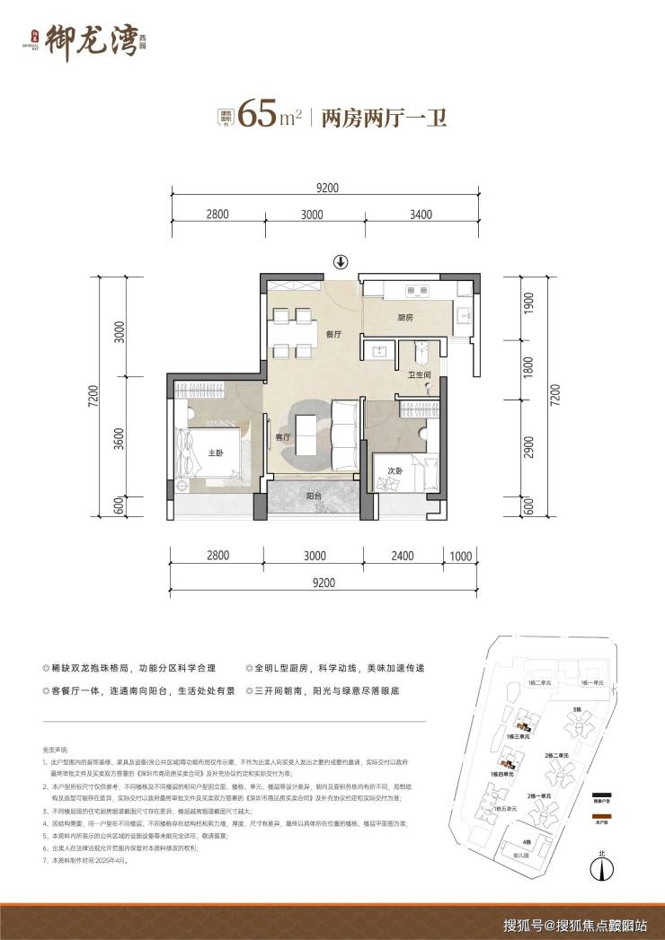 65平两房两厅一卫设计的是竖厅稀缺的双龙抱珠格局,客厅开间3米,三开间朝南,L型厨房,卫生间分离设计,得房率约73.26%(不含赠送),西南朝向,加上赠送得房率约80%。