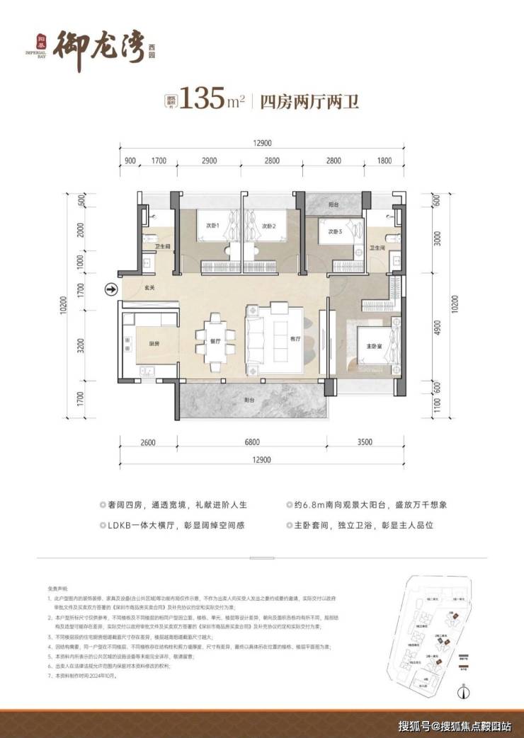 135平四房两厅两卫设计的是横厅南北通透格局,客餐厅开间6.8米,LDKB一体化设计,四开间朝南,U型厨房,公卫三段式分离设计,得房率约79.25%(不含赠送),阳台主朝东南或西南向,加上赠送得房率约90%。