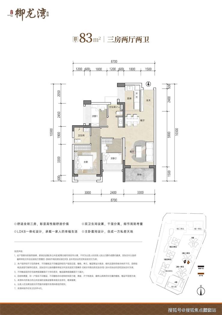 83平三房两厅两卫设计的是竖厅格局,客厅开间3.3米,LDKB一体化设计,三开间朝南,U型厨房,公卫三段式分离设计,得房率约79.25%(不含赠送),东南或西南朝向,加上赠送得房率约90%。阳基御龙湾售楼处电话☎:4001669557✔✔✔阳基御龙湾营销中心电话☎:400-166-9557✔✔✔
