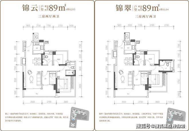 户型面积:建面约 88-89㎡三房两厅两卫,107-130㎡四房两厅两卫,全南朝向,竖厅设计,采光通风俱佳。