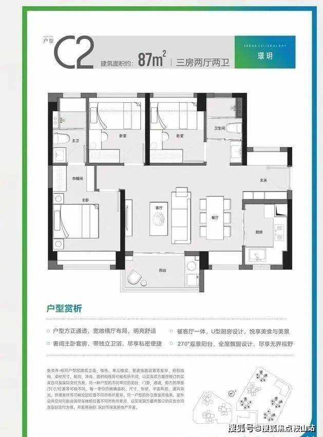 约87㎡三房两卫(1栋2单元03/04户型、3栋1单元05/06户型、3栋2单元04户型、5栋05户型)横厅格局,餐客一体化,卫生间干湿分离设计,有东南朝向、西南朝向。