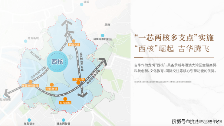 吉华承担着建设龙岗区“一芯两核多支点”发展战略中的“西核”——数字信息核、协同周边区域打造世界级ICT产业集群承载区、构筑龙岗“都市科技绿芯”的使命任务。片区与坂雪岗科技城仅一路之隔,具备承载世界级电子信息产业集群辐射的政策优势和天然区位优势。