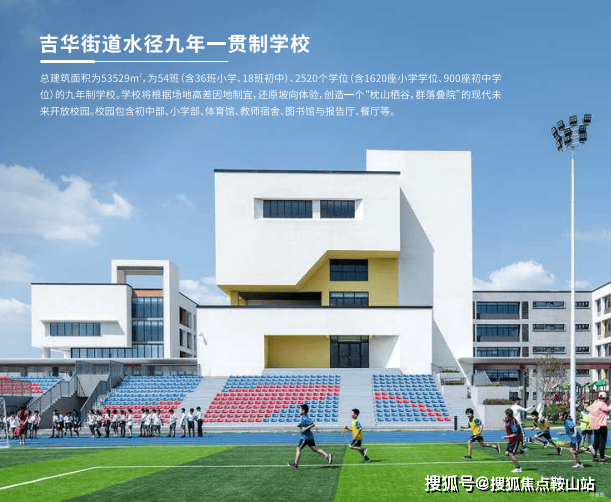 54班九年一贯制学校,提供2520个学位,总建筑面积约5.35万平方米,包含初中部、小学部、体育馆、教师宿舍、图书馆与报告厅、餐厅等。