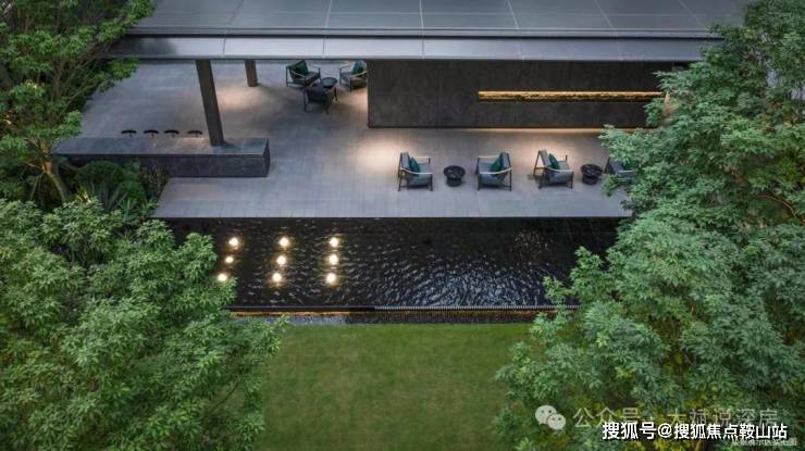 主入口依靠回龙河畔,在开敞式迎宾前广场设置跌水景观,结合名贵树种罗汉松,让尊崇出入道是寻常;超30m门庭设计,以仿古代照壁之手法,精选浪淘沙天然石材与古铜型材,尽显当代精奢雅致气质,演绎独属于东方门第的尊崇仪式。