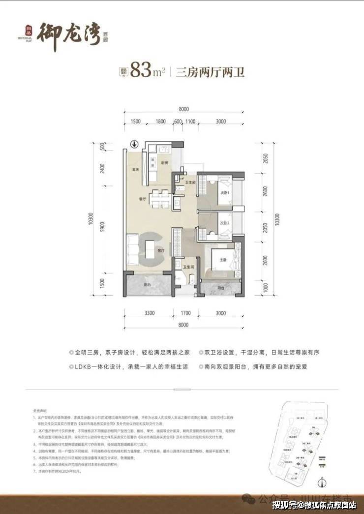 83㎡三房两卫:总价约330万起,LDKB一体化设计,三开间朝南,U型厨房,公卫三段式分离设计,得房率约90%。