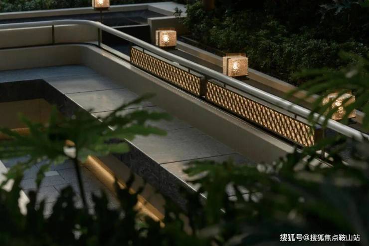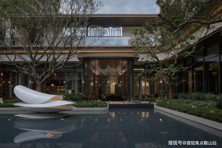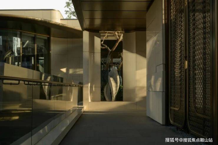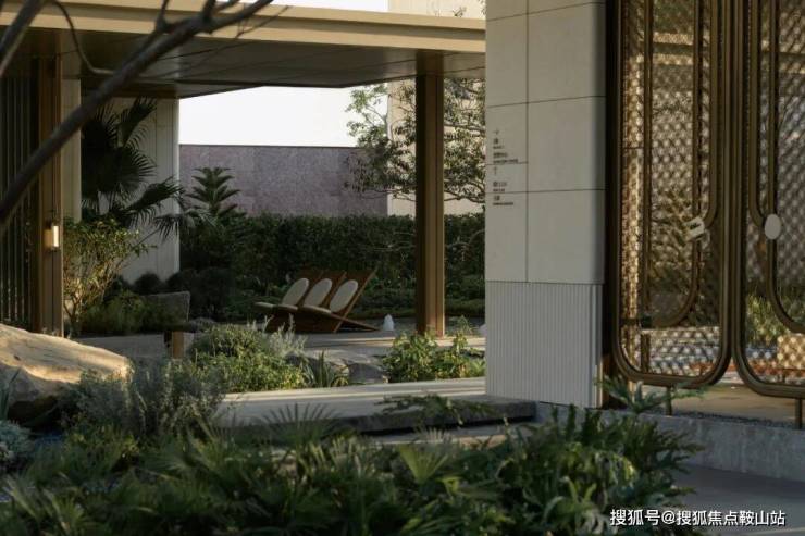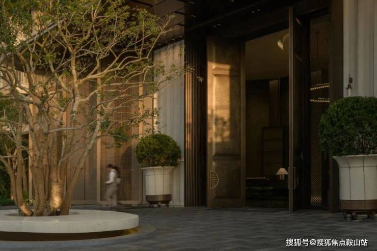 “玉阙巍峨立云间,主门洞开迎春江”。酒店式入口以仪式感水景开场,人车分流动线隐现尊崇。海浪灰石材与香槟金金属格栅交叠,光影流转间,仿若踏入一幅流动的东方画卷。礼宾环岛由白冰玉石与玉树·古桩铁冬青相互交织,以黎族织锦为灵感,光影交错,展示海南文化深厚底蕴。主两侧景墙后两棵特选雨树,高约12m,枝叶繁茂如伞状撑开,搭配艺术灯具点缀,归家的每一步,皆是身份的礼赞。