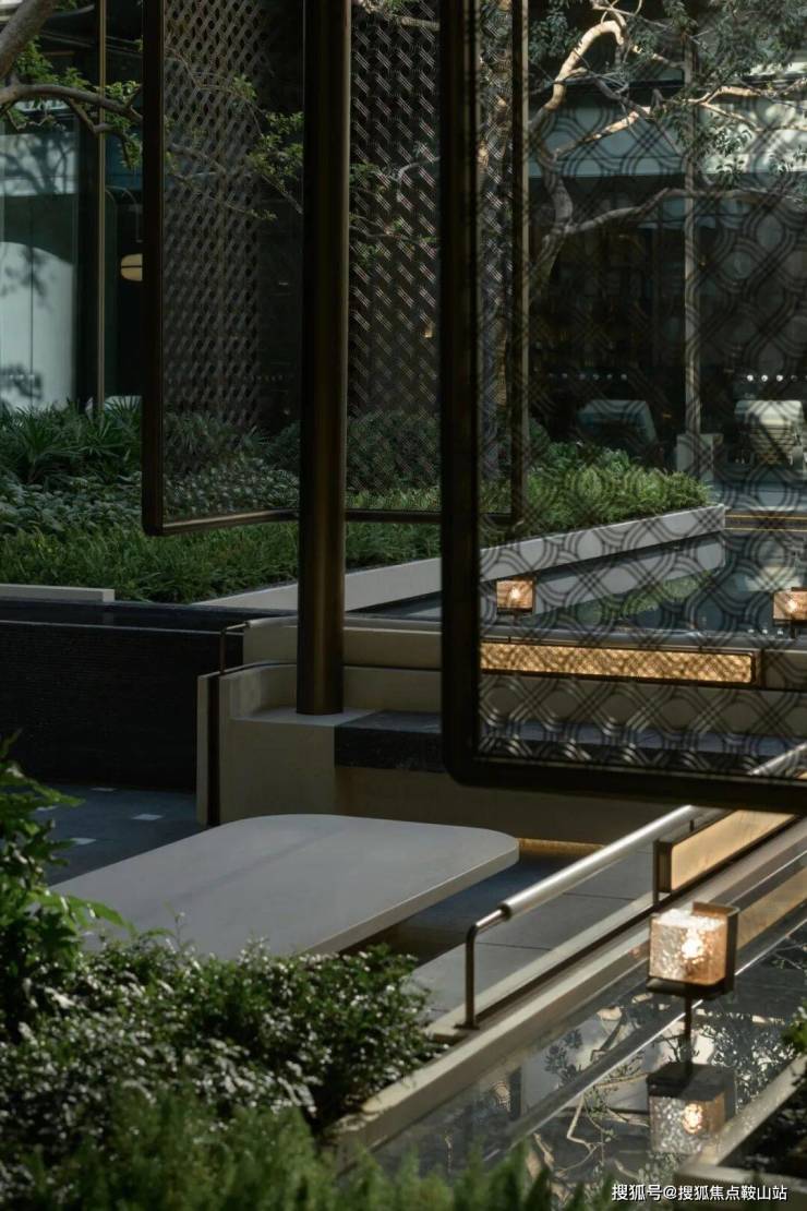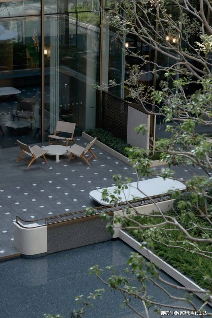 下沉庭院是献给都市人的精神绿洲。“玉庭幽深映碧泉,锁住云烟锁住闲”。私密洽谈区与共享会客厅隐于碧水与风雨连廊之间,四棵铁冬青环绕一棵巨形朴树,枝影摇曳,仿海洋蓝陶瓷砖映着波光,勾勒出“大隐于市”的静谧画卷。一杯咖啡、一池静水,时光在此慢了下来。